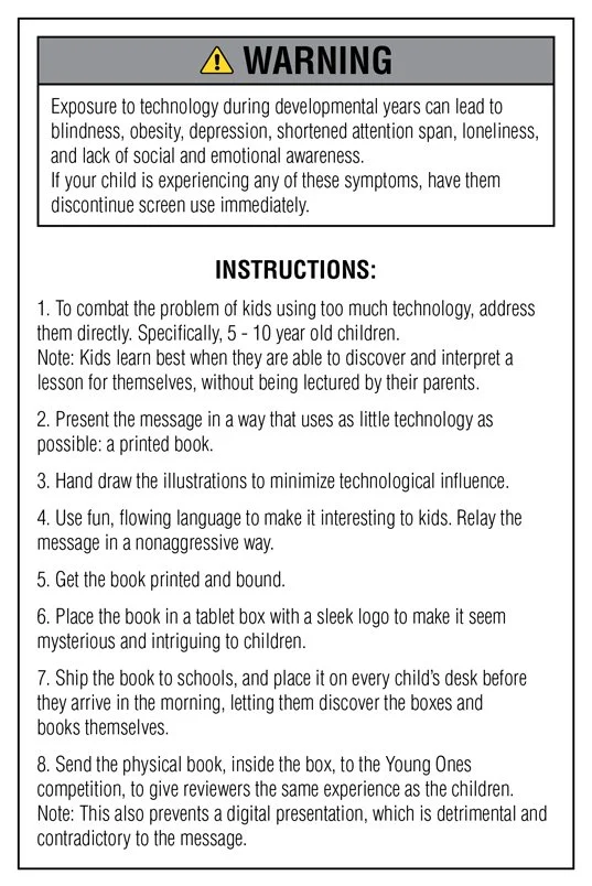 Idea: There was a need to communicate the message of how technology was taking over kids’ childhood. What better way to do so than through a children's book. So, we wrote and illustrated one.